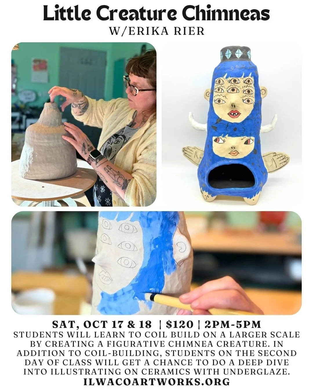 I have a deep love of the coast as it reminds me of growing up in Maine. Last fall when I stayed at Sou’Wester for the first time, I immediately felt that connection and knew I would return. Now I am very excited to combine my love of the coast with my love of ceramics with this very fun workshop I will teach on October 17 & 18 at the Ilwaco Artworks. Over two days we will handbuild and decorate chimneas that you can use for many years to come. I hope you’ll join me!